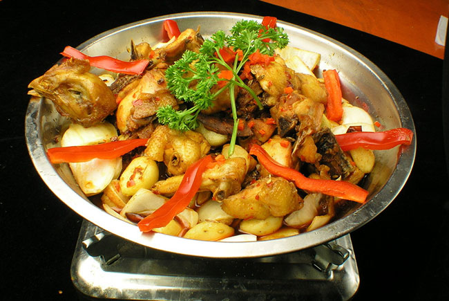 杜婆鸡源自湖北松滋沙道观镇。因一位七十多岁的杜姓老婆婆始创而得名。精选松滋本地土鸡,首先用大火将鸡块用油煎焖,再放入精盐、姜块、料酒、蒜瓣(苗)、啤酒、八角茴、农村自制豆瓣酱、干红辣椒皮,干焖,配上松滋本地产的“炖钵炉子”放水烹饨,鸡肉色泽金黄,富有韧劲,鲜香怡人,油而不腻,辣得过瘾。